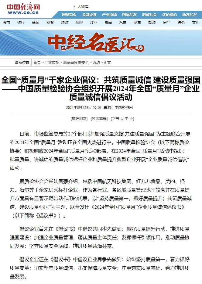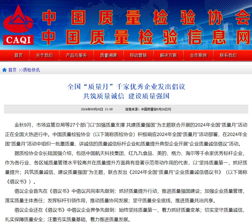 每年9月是全國“質量月”,由市場監(jiān)管總局等27個部門以“加強質量支撐 共建質量強國”為主題,聯(lián)合開展的“質量月”活動。在2024年全國“質量月”活動中組織一批重質量、講誠信的質量誠信標桿企業(yè)和質量提升典型企業(yè)開展“企業(yè)質量誠信倡議”活動。 其中,包括重慶紅九九食品等千余家優(yōu)秀標桿企業(yè),以“堅持質量第一,抓好質量提升;共筑質量誠信,建設質量強國”為主題,聯(lián)合發(fā)出《2024年全國“質量月”企業(yè)質量誠信倡議書》(以下簡稱《倡議書》)。 倡議企業(yè)首先在《倡議書》中倡議共同率先做到:抓好質量提升行動,推進質量強國建設;加強企業(yè)質量管理,落實質量主體責任;發(fā)揮標桿引領作用,推動質量協(xié)同發(fā)展;堅守質量安全底線,推進質量共治共享。 倡議企業(yè)還在《倡議書》中倡議企業(yè)界爭先做到:始終堅持質量第一,著力抓好質量變革;切實堅守質量誠信,扎實保障質量安全;注重夯實質量基礎,著力推進質量發(fā)展。 倡議企業(yè)同時在《倡議書》中倡議全社會努力做到:共同筑牢質量誠信,助推中國質量發(fā)展;發(fā)揮質量社會共治,唱響中國質量精神;推進建設質量強國,共創(chuàng)中國質量輝煌。 (中國經濟網報道)