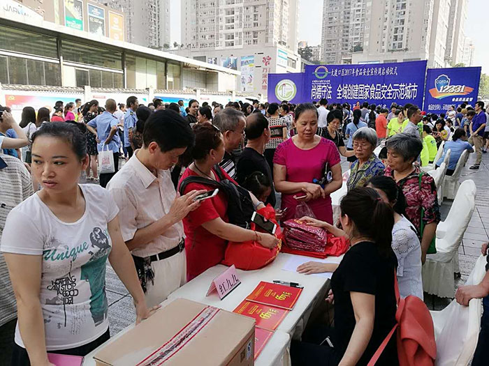 7月10日上午,大渡口區(qū)在九宮廟步行街組織開展以“尚德守法”“全域創(chuàng)建國(guó)家食品安全示范城市”為主題,暨食品安全宣傳周宣傳的廣場(chǎng)宣傳活動(dòng)。區(qū)食品藥品監(jiān)督管理分局、區(qū)衛(wèi)生計(jì)生監(jiān)督執(zhí)法局、區(qū)疾控中心、區(qū)食品銷售商戶代表參加了活動(dòng)。區(qū)政府副區(qū)長(zhǎng)毛偉出席此次活動(dòng)。紅九九食品公司也受邀參與了現(xiàn)場(chǎng)的各項(xiàng)活動(dòng)。